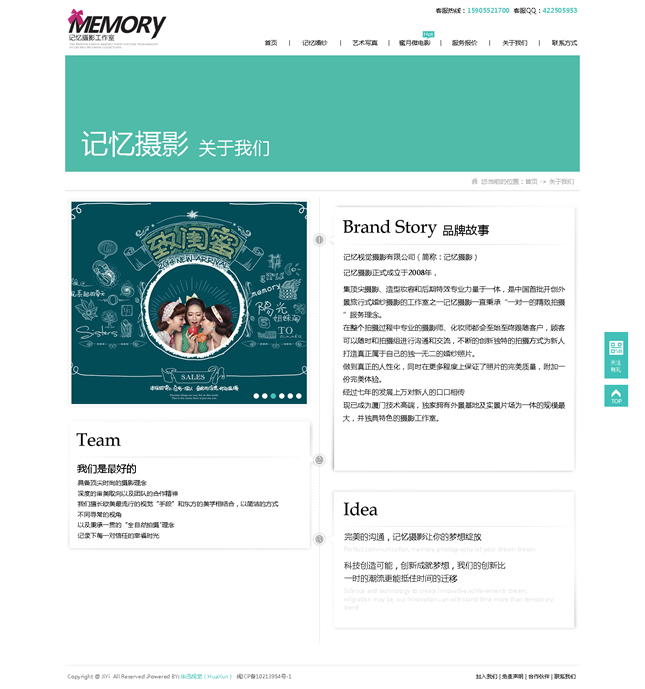 記憶視覺攝影有限公司(簡稱:記憶攝影)記憶攝影正式成立于2008年,集頂尖攝影、造型妝容和后期特效專業(yè)力量于一體,是中國首批開創(chuàng)外景旅行式婚紗攝影的工作室之一記憶攝影一直秉承“一對一的精致拍攝”服務(wù)理念。在整個(gè)拍攝過程中專業(yè)的攝影師、化妝師都會至始至終跟隨客戶,顧客可以隨時(shí)和拍攝組進(jìn)行溝通和交流,不斷的創(chuàng)新獨(dú)特的拍攝方式為新人打造真正屬于自己的獨(dú)一無二的婚紗照片。做到真正的人性化,同時(shí)在更多程度上保證了照片的完美質(zhì)量,附加一份完美體驗(yàn)。