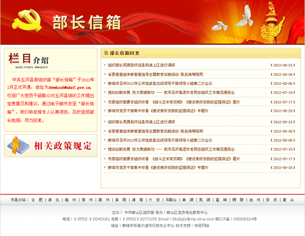 中共五河縣委組織部“部長(zhǎng)信箱”于2012年2月正式開(kāi)通,地址為bbwhzzb@ahxf.gov.cn。歡迎廣大黨員干部群眾對(duì)五河縣組織工作提出寶貴意見(jiàn)和建議,通過(guò)電子郵件發(fā)至“部長(zhǎng)信箱”,我們將安排專(zhuān)人認(rèn)真瀏覽,及時(shí)呈報(bào)部長(zhǎng)批閱,盡力回復(fù)。